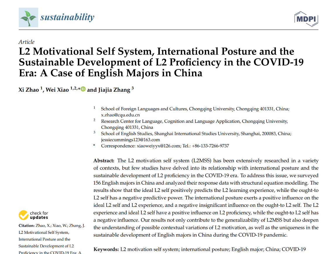 副教授、语言认知及语言应用研究基地专职研究员肖巍博士指导本科生和硕士生撰写的研究论文L2 Motivational Self System, International Posture and the Sustainable Development of L2 Proficiency in the COVID-19 Era: A Case of English Majors in China于SSCI二区期刊Sustainability(影响因子3.889)在线出版。肖巍博士为论文通讯作者,合作者为其指导的本科生张家佳(现于上海外国语大学英语学院读研)和研二硕士生赵曦。DOI: 10.3390/su14138087