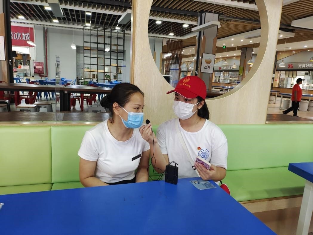 党委书记欧玲、党委副书记魏世平、团委书记汪俣婧等领导老师进行了院校的防疫政策咨询。除此之外,实践团还对2020级本科学生王颖和校园内第一食堂的食品安全员叶春明等工作人员进行了随机采访,从各个层面深入了解98堂