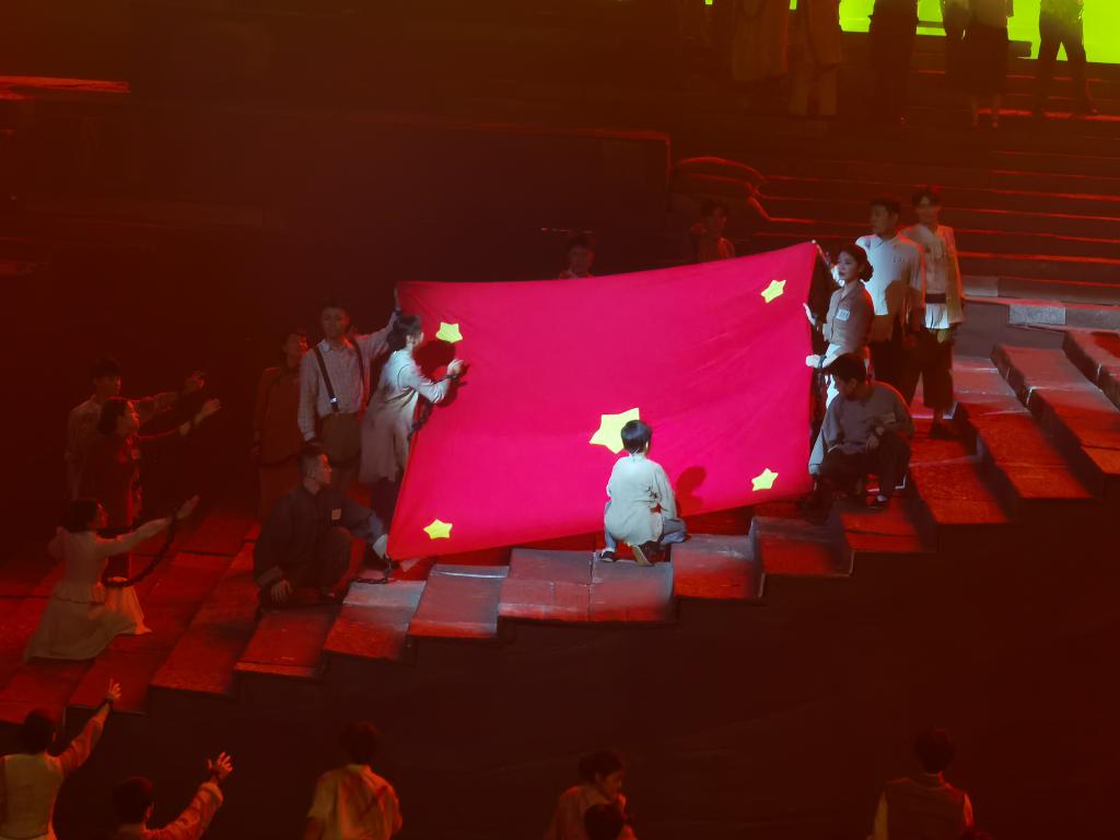 《重庆1949》是对红岩烈士们信仰、抉择、牺牲和新生的完美诠释。枪声在耳边响起,炮弹“震翻”座椅;透过牢笼,甚至看得见革命者脸上的血在流淌;抬头仰望,滚滚的江水从天而降。每一分每一秒,眼前的景物都在变化,仿佛真正置身于当年激荡起伏的革命岁月中。其中有一幕给成员们留下了很深的印象。当新中国成立的消息传到狱中,烈士们拿一床红被子做一面五星红旗,每个人都在诉说着自己心中的梦想,期待着出去的那一天,期待着新的生活。这一幕让我们无比真切的感受到了他们也曾离希望那么近,最后的牺牲更是让人痛心。看完剧目,成员们心中深深的震撼感迟迟无法消散。1949不仅仅是一个简单的数字,更是历史厚重一页浓墨重彩的一笔。《重庆1949》以一种在当代社会喜闻乐见的形式,将历史送至观众眼前,结合科技模拟出更加真实的效果。历史的厚重感和隔阂感在这一瞬间变得很薄,仿佛一瞬间触手可见。