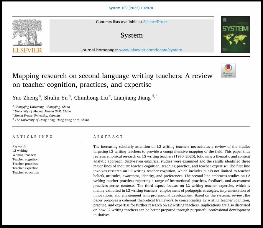 教师郑尧博士(第一作者)与澳门大学于书林博士、加拿大西蒙弗雷泽大学刘春宏博士以及香港大学蒋联江博士的合作研究成果“Mapping research on second language writing teachers: A review on teacher cognition, practices, and expertise”在SSCI语言学期刊System上发表(2021影响因子/JCR分区:4.518/Q1)。该文是郑尧博士主持的国家社会科学基金项目“积极心理视域下中国外语学习者多语写作投入的多维度动态研究”(21CYY018)的阶段性成果。