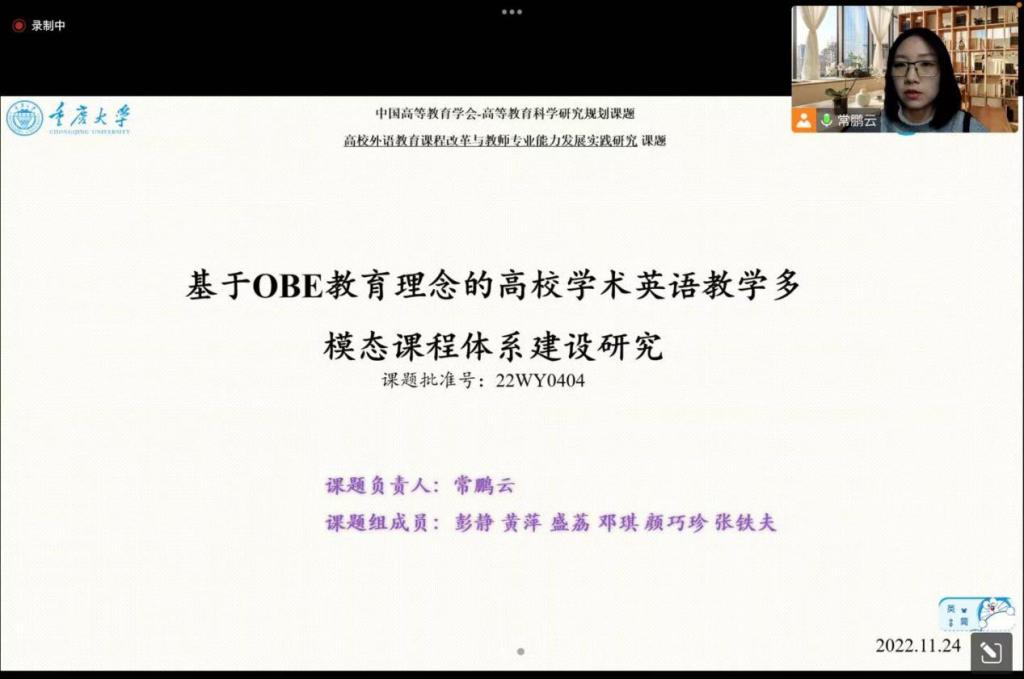 2022年11月24日下午2点,中国高等教育学会-高等教育科学研究规划课题-“基于OBE教育理念的高校学术英语教学多模态课程体系建设研究”(22WY0404)开题报告会于线上举行。课题组成员以及来自重庆交通大学的李翠英教授、香港教育大学的蒋联江教授和加拿大UBC大学原继续学习学院语言文化系主任孙浪教授等专家参加了开题报告会。