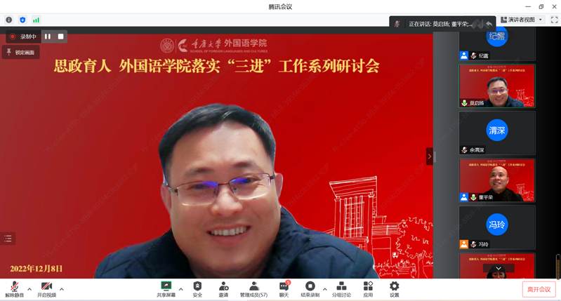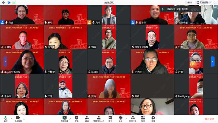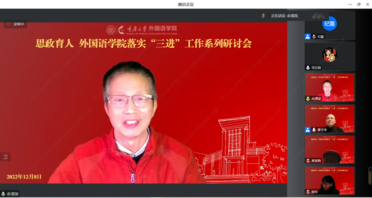 课程思政落实工作系列研讨会顺利举行。研讨会由外语专业本科教育中心主任董平荣主持,莫启扬院长、欧玲书记出席了本次会议,余渭深教授担任点评嘉宾,四个专业系老师60余人参加了本次研讨会。