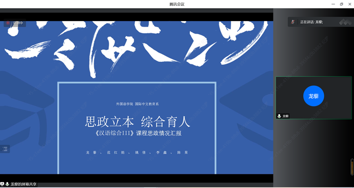 龙藜老师从总体设计、具体措施、课程建设效果三个部分介绍了《汉语综合III》的课程思政情况。该课程在价值传播中注意知识含量,知识传播中注意价值观引领,在教师教学中注意示范引导,充分发挥课程所承载的育人功能,实现知识传授、能力培养和价值引领的有机统一,在教学中尤其强调教学育人和管理育人的重要性,“融合教学,融合管理”的双融模式令人耳目一新。