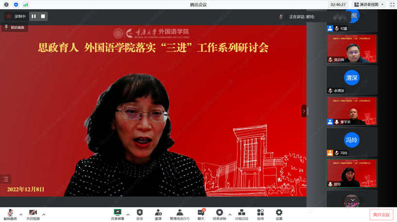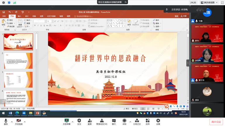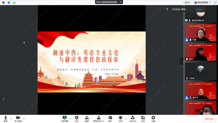 会上,首先由英语系毛凌滢、盛荔、余泽梅三位老师进行了《融通中西:英语专业文化与翻译类课程思政探索》为主题的分享,从宏观、中观、微观三个层面介绍了英语系课程思政的探索。