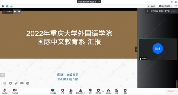 国际教育中文系也分享了“国际中文教育的课程思政教学探索”。系主任袁继锋老师首先介绍了国际中文系整体情况。