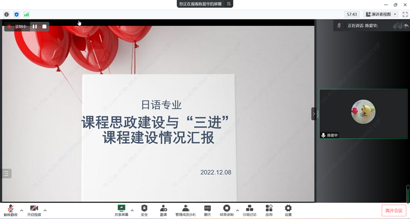 日语系以“课程思政建设暨‘三进’课程建设情况”为主题汇报了相关建设成果。陈爱华老师介绍了日语专业“三进”课程建设的建设目标、实施步骤以及课程设置基本原则。日语专业思政课程《理解当代中国》系列教材中对应课程为中心,以其他专业核心课程为辅助,将“三进”思想全面融入日语专业教学。目前日语专业有两门课程列入98堂