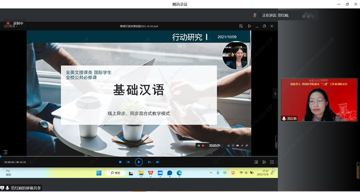 范红娟老师分享的是“基础汉语:线上异步、同步混合式教学模式”。该课程将行为心理学的自我决定理论与教学目标和思政目标有机结合,充分利用异步,缩减互动规模,缩短互动时长,将线上异步、同步有机结合,教学效果十分显著。