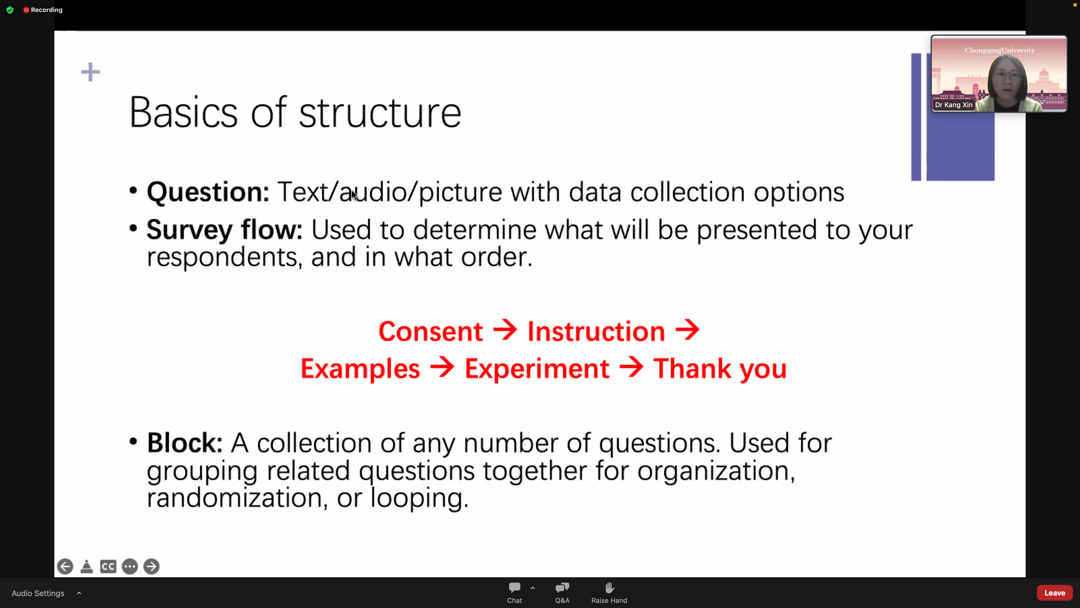 近年受疫情影响,在线实验工具广受热议,康鑫教授已有超过十年的使用经验,她以近期发表的研究成果和正在进行的研究项目为例,分享在线研究工具在语言数据收集和处理的实际应用及其特点,重点讲解Qualtrics、Gorilla和腾讯会议三款工具。讲座伊始,康鑫教授从Qualtrics用户界面开始,讲解研究常用的反应计时、屏幕强制停留等功能,分享了搭配使用编程语言进行媒体文件预加载和干扰信息隐藏处理等小技巧。她讲述了与荷兰鹿特丹大学的Rolf Zwaan教授、香港中文大学黄俊文教授等合作者使用Qualtrics和MTurk采集成年人语言加工数据的经验。康鑫教授也分享了98堂