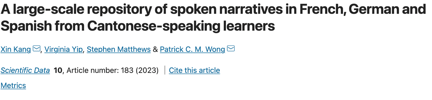 1.Kang, X.*,Yip, V., Matthews, S., & Wong, P. C. M.* (2023). A large-scale repository of spoken narratives in French, German and Spanish from Cantonese-speaking learners.Scientific Data,10(1), 1–9.//doi.org/10.1038/s41597-023-02090-6