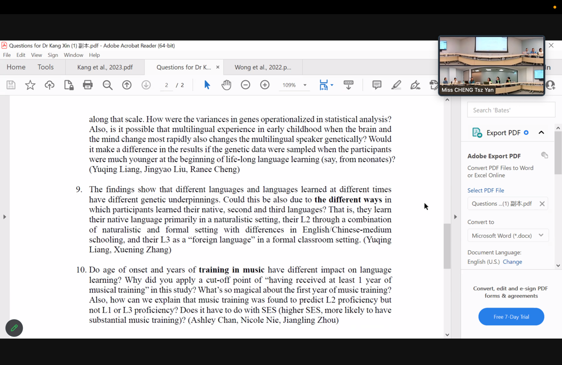 组会伊始,麦子茵博士向康鑫教授的到来表示欢迎,双方团队互相介绍各自研究方向和正在进行的工作。随后,麦子茵博士课题组的博士生张雪宁和研究助理聂嘉淇先后展示了康鑫教授近期发表的两篇期刊文章,分别是“A large-scale repository of spoken narratives in French, German and Spanish from Cantonese-speaking learners”和“Contributions of common genetic variants to specific languages and to when a language is learned”。