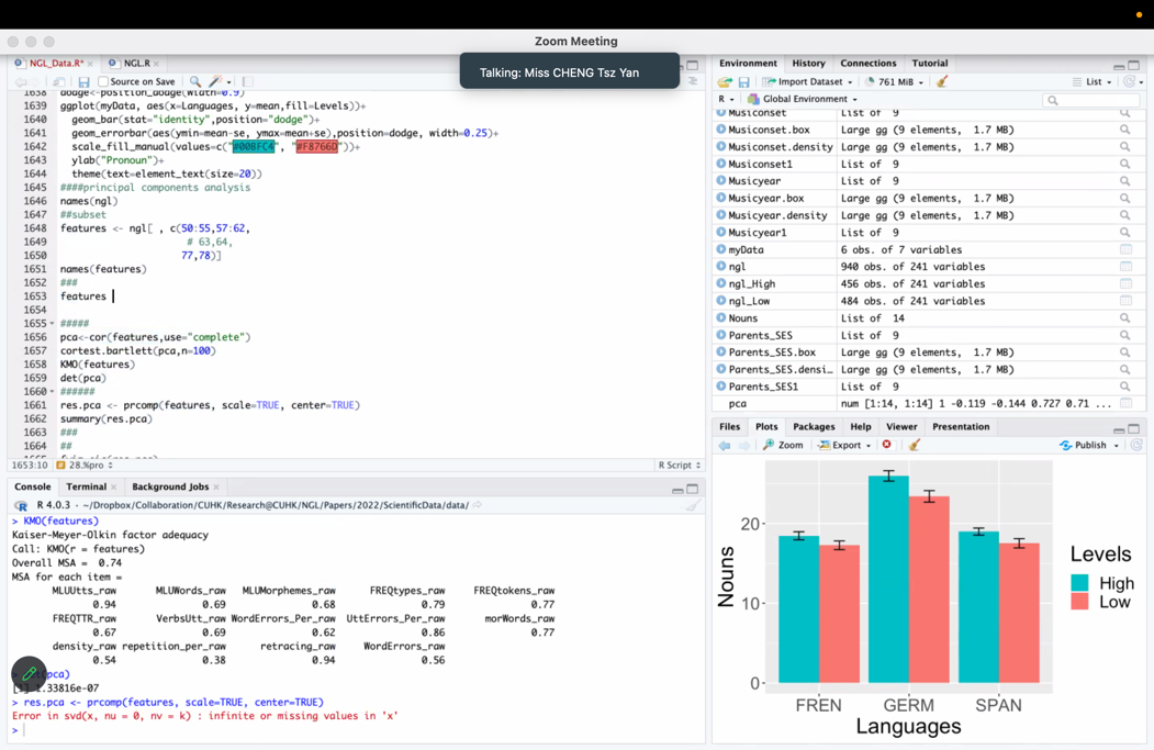 随后,麦子茵博士课题组成员围绕这两项研究向康鑫教授提出了10个具体问题,康鑫教授均予以解答。她为大家详细解释图片命名实验任务的设置意图、主成分分析(Principal Component Analysis)等统计学方法的原理及应用,分享推进语言产出数据转录和标注工作的项目管理经验。针对大家最为关注的数据分析学习和科研绘图问题,康鑫教授推荐了Discovering Statistics using R等书目,并共享屏幕展示使用R语言的绘制论文中关键图表的步骤。