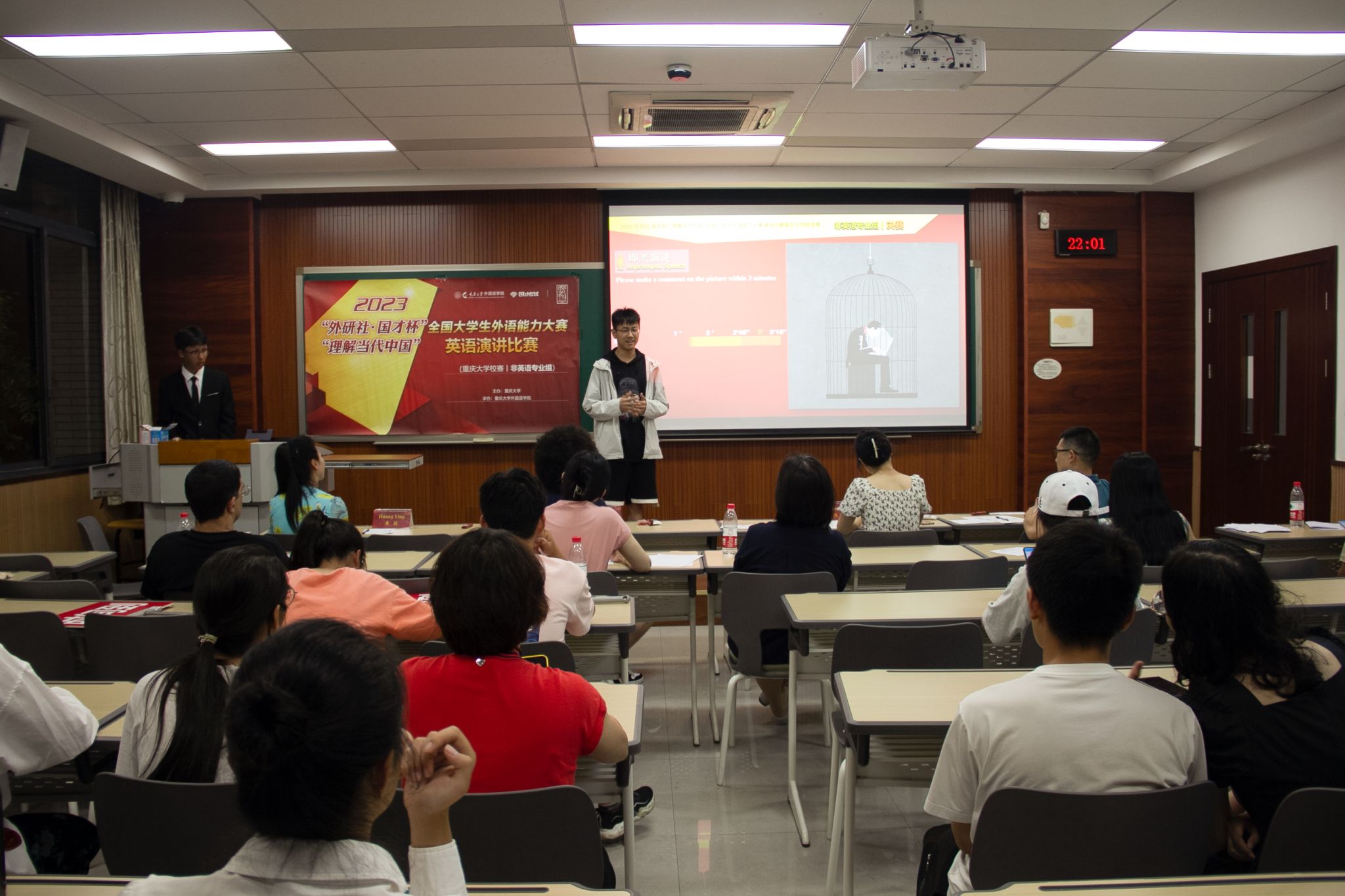 英语演讲比赛分英语专业组、非英语专业组两个组别于7月、9月先后进行。非英语专业组英语演讲比赛于7月6日在虎溪校区第一教学楼进行,98堂