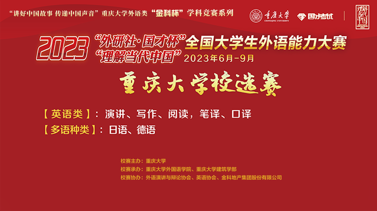 建筑学部承办,学生外语演讲与辩论协会、英语协会、金科地产集团股份有限公司协办。各赛项历时三个月选拔,累计吸引了全校31个学院超70个专业的本科生、硕士生、博士生近千名外语学习兴趣浓厚的学生参赛逐鹿,评选出248名获奖选手。其中,英语演讲比赛获奖选手48人,英语专业组17人, 非英语专业组31人;英语写作比赛获奖选手38人,英语专业组17人, 非英语专业组21人;英语阅读比赛获奖选手105人,英语专业组64人,非英语专业组41人;英语口译比赛获奖选手13人;英语笔译比赛获奖选手40人;多语种类比赛获奖选手4人。