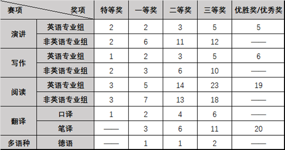经过线上线下两阶段的激烈角逐,英语专业组评选出特等奖2名、一等奖2名、二等奖3名、三等奖5名、优胜奖5名,非英语专业组评选出特等奖2名、一等奖6名、二等奖11名、三等奖12名。