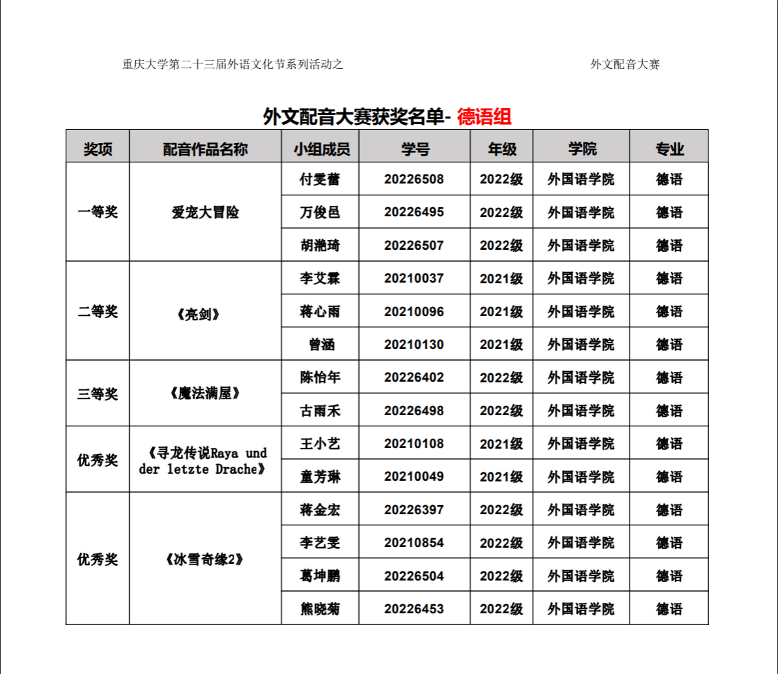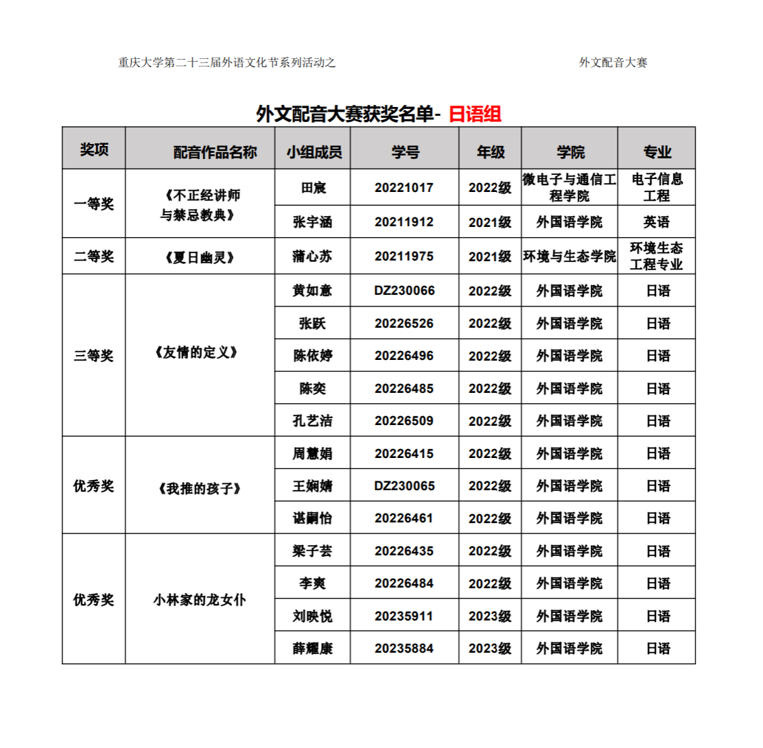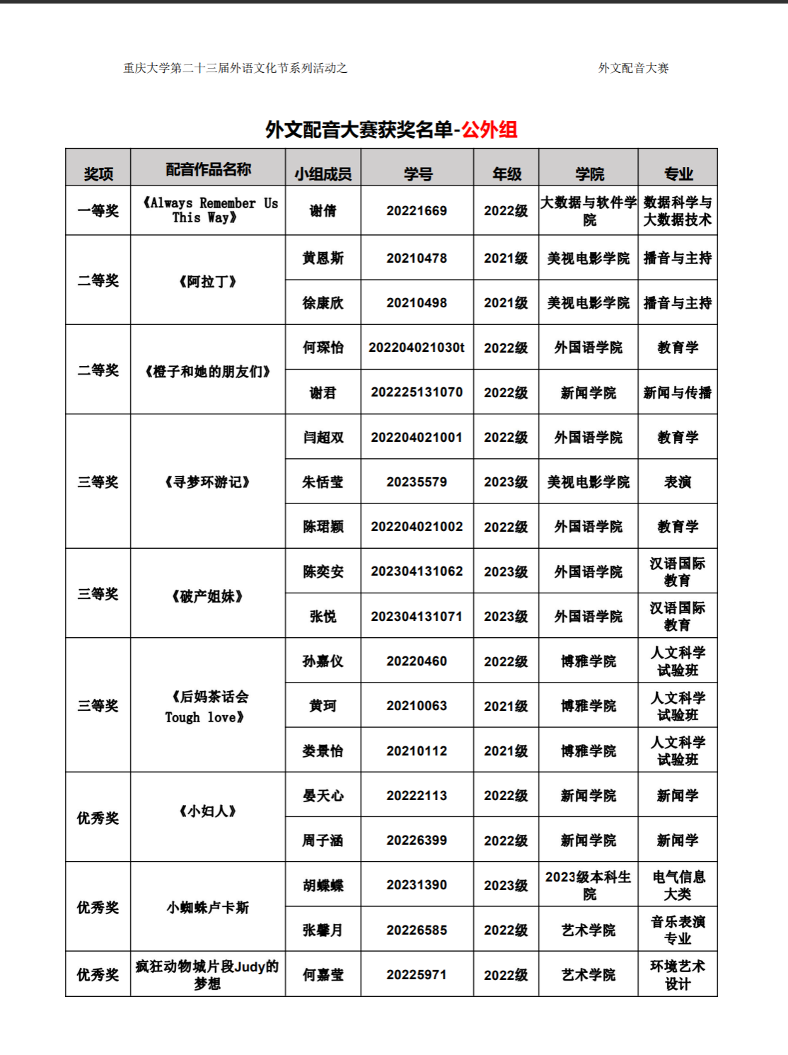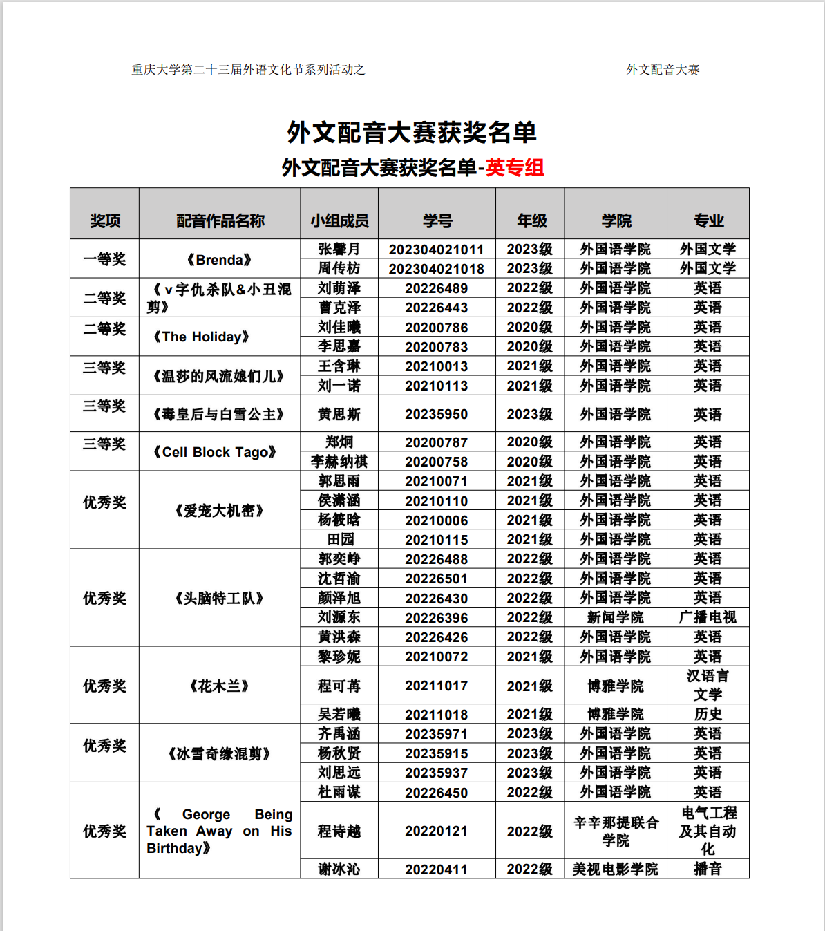 由98堂 主办、98堂 承办的98堂 第二十三届外语文化节系列活动之外文配音大赛已经结束。赛事自11月18日启动以来,吸引到全校多支队伍前来参与,评选出31个获奖组。其中,英语专业组共11个获奖组29名获奖选手,公共外语组共9个获奖组18名获奖选手,日语德语组共10个获奖组29名获奖选手。 现将外文配音大赛获奖名单进行公布。