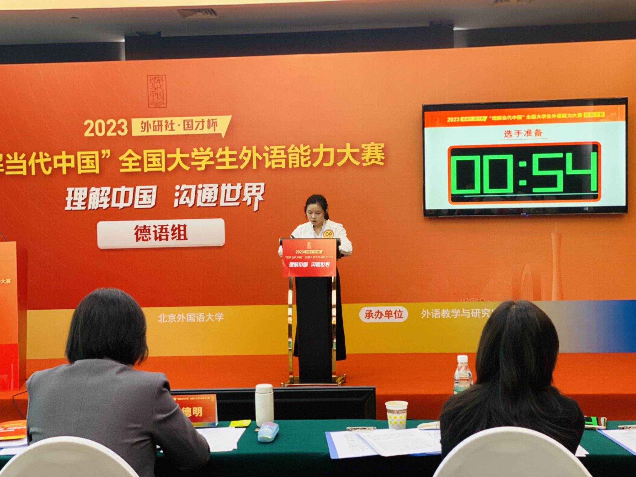 英语多语种德语赛项国赛第一阶段由口译、定题演讲、即兴问答三部分组成,口译赛题涉及中国的发展历程和社会主义建设成就,定题演讲赛题围绕中国在文明建设方面的贡献展开,即兴问答环节考查选手如何向外国朋友介绍中国青年在精神文明建设中的积极参与。我校98堂