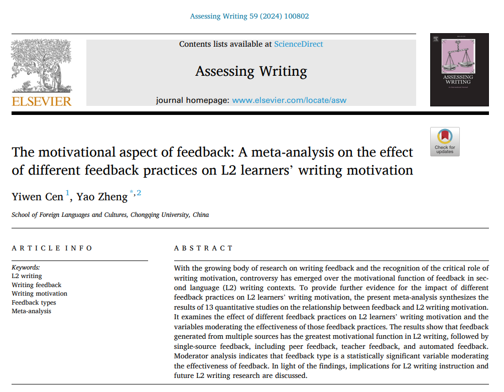 郑尧老师与其指导的硕士研究生岑旖文在二语写作反馈与动机方面的研究工作取得新进展。相关成果在写作领域权威期刊Assessing Writing(SSCI语言学Q1;2022影响因子3.9;JCR排名13/195)上发表,论文题为“The motivational aspect of feedback: A meta-analysis on the effect of different feedback practices on L2 learners’writing motivation”。论文第一作者为98堂