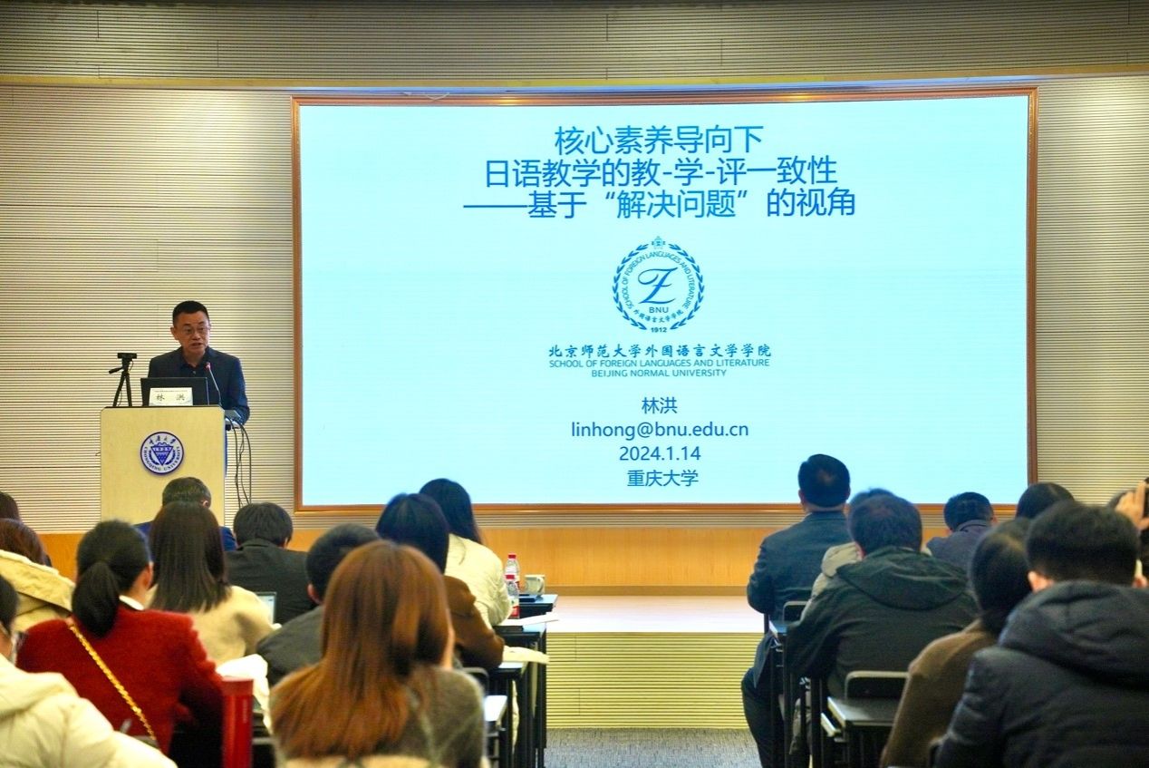 在基调报告环节,北京师范大学林洪副教授以“核心素养导向下日语教学中‘教、学、评一体化’”为题,结合大量实例,就日语教学中如何通过有效的评价环节解决问题,进行了生动而富于启发性的讲解和指导。98堂