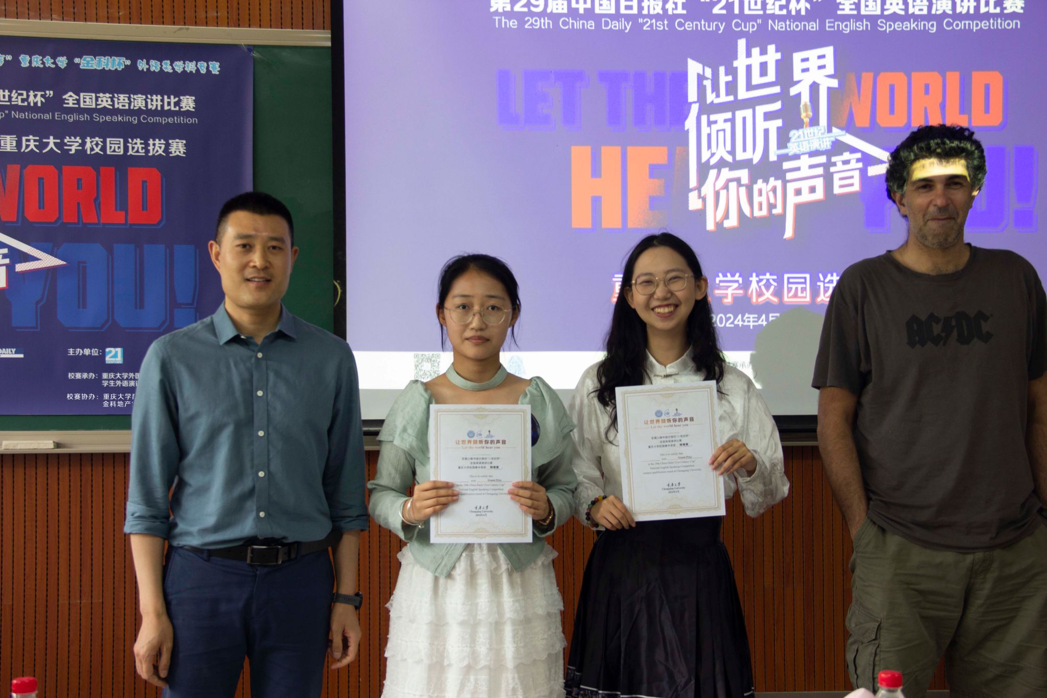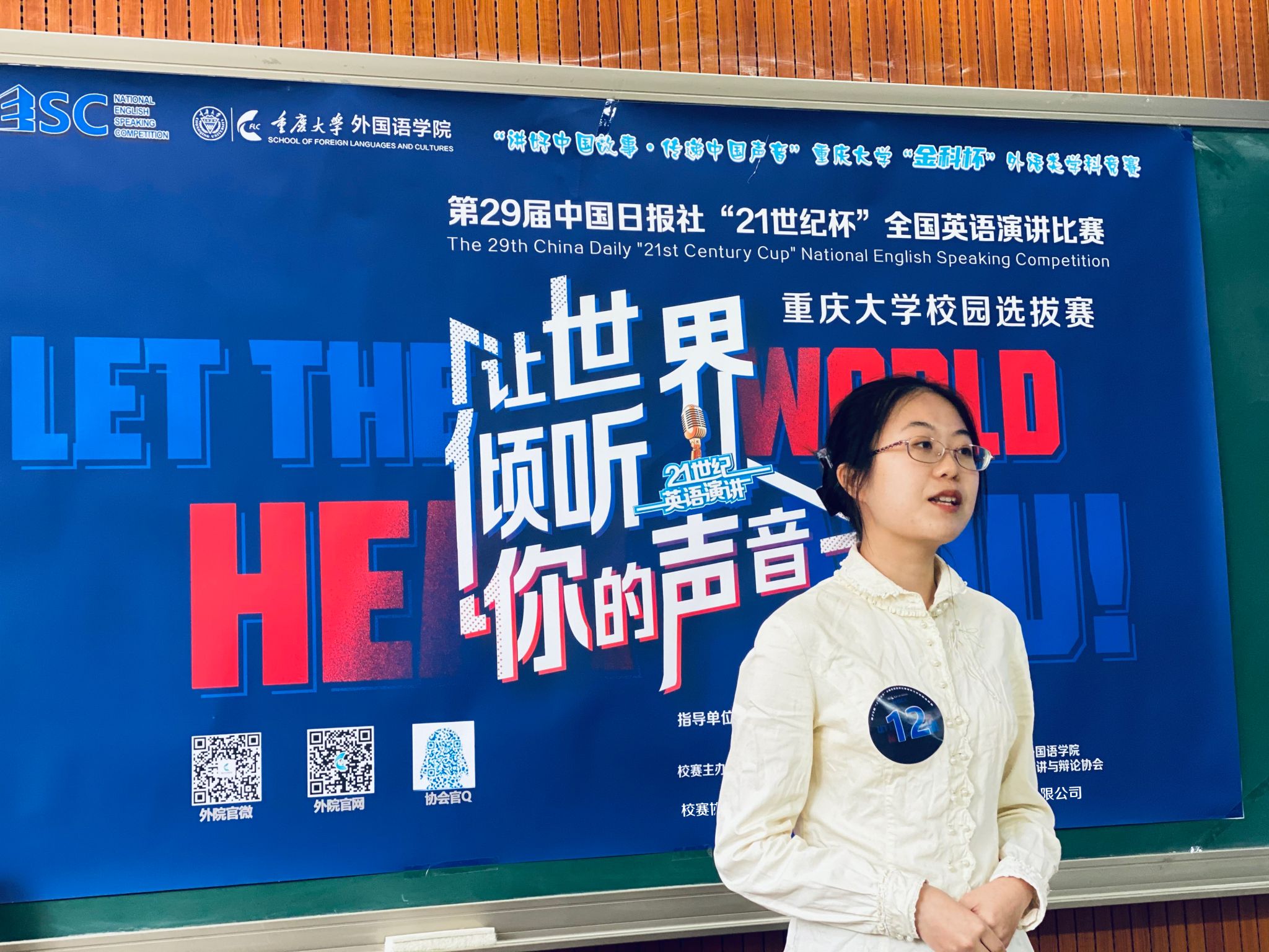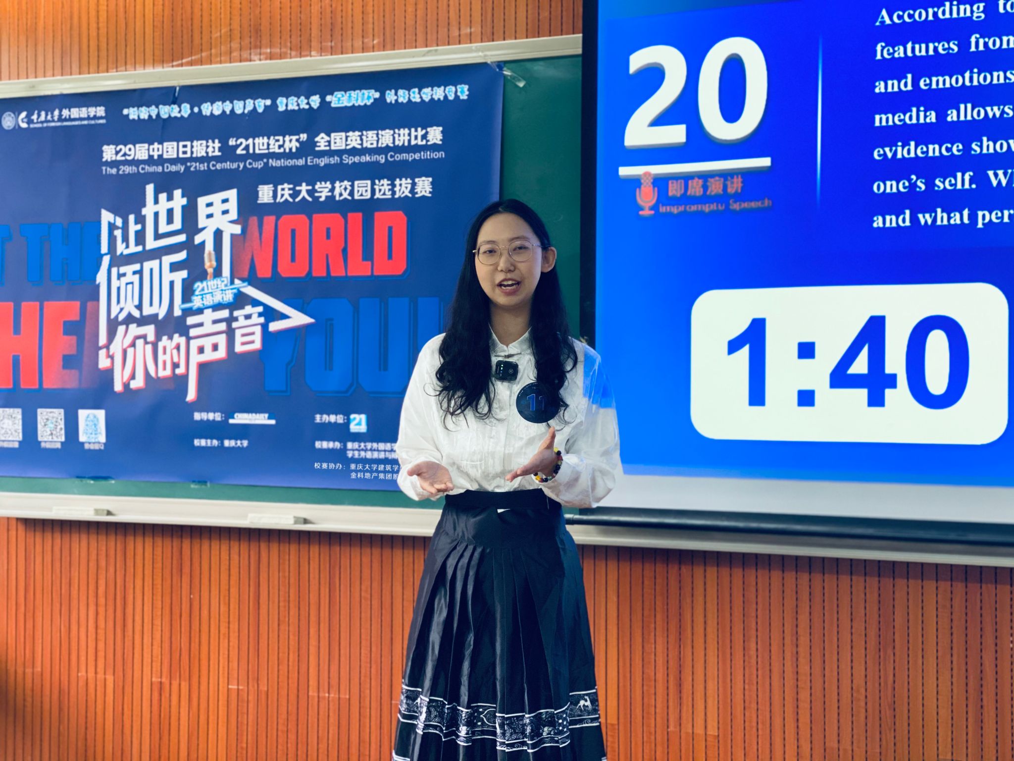 校选赛在虎溪校区第一教学楼D1202圆满收官。本赛事由中国日报社主办、21世纪英语教育传媒承办,大赛校选赛由98堂