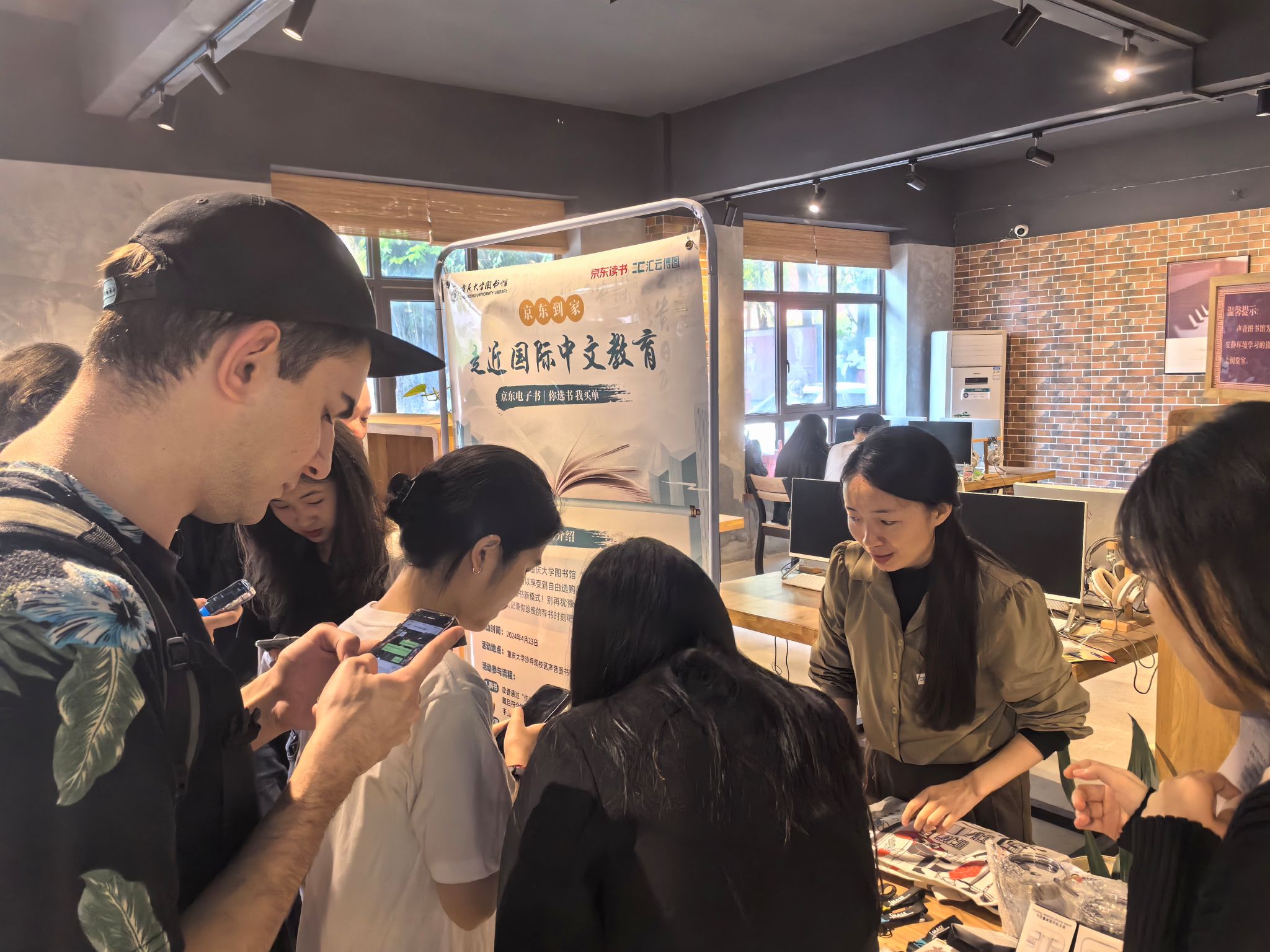 A区声音图书馆内,图书馆组织的“京东到家,走进国际中文教育”专场活动也同时如火如荼地进行。京东服务人员热心讲解购书规则,通过“京东到家”平台,帮助师生轻松选购书籍,享受便捷高效的购书体验。此次活动立足于汉语教学文献资源的建设,为学校国际中文教育专业的发展注入新的动力。