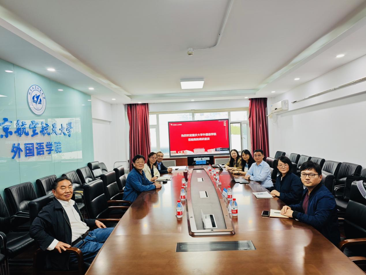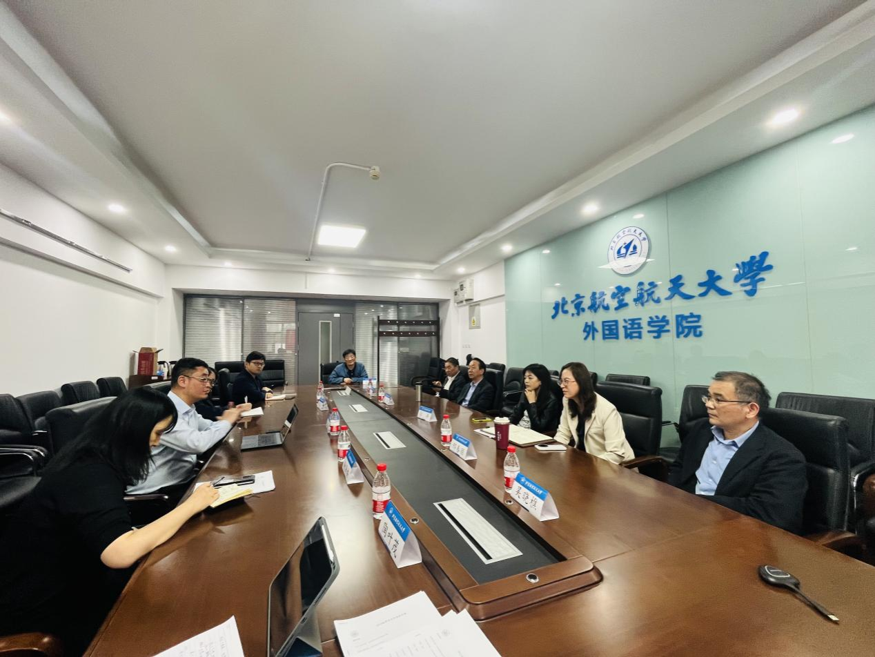 院长梁茂成教授、副院长邢春丽副教授,翻译系文军教授,英语文学系田俊武教授,德语系主任吴晓樵教授,语言科学与工程系主任徐涛副教授参加调研座谈会。梁茂成院长对调研团队的到来表示热烈欢迎,并介绍了北京航空航天大学98堂