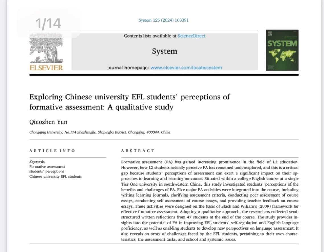 青年教师颜巧珍在语言学类SSCI期刊System发表学术论文。该论文题目为 Exploring Chinese University EFL Students’ Perceptions of Formative Assessment: A Qualitative Study,颜巧珍老师为论文唯一作者,论文受98堂