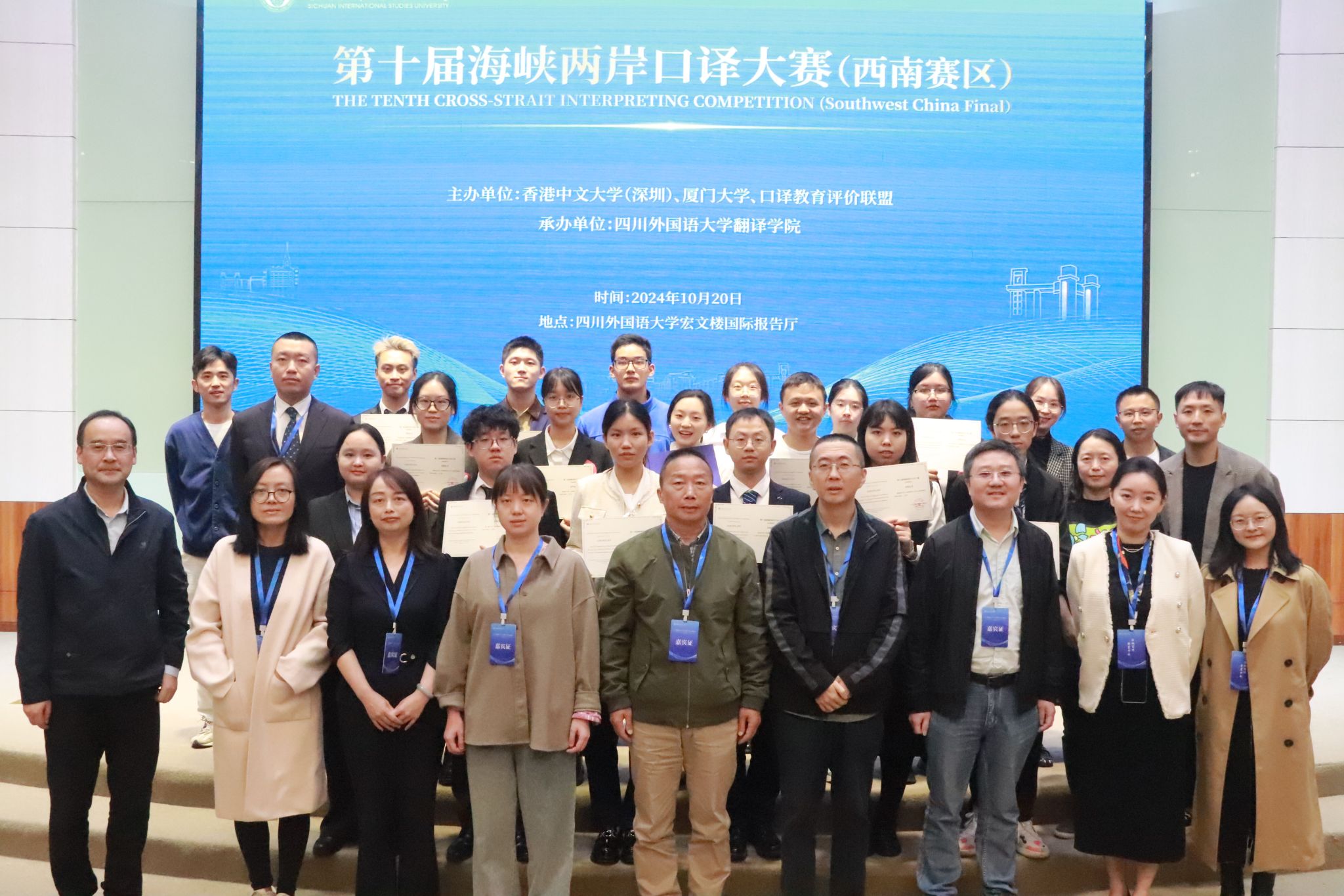 2024年10月20日,第十届海峡两岸口译大赛西南区级赛在四川外国语大学宏文楼2楼国际报告厅举办,由香港中文大学深圳校区、厦门大学及口译教育评价联盟联合主办,四川外国语大学翻译学院承办,来自重庆、贵州、四川、西藏和云南等五个省(市)的选手齐聚山城,展开了激烈的较量。我校98堂