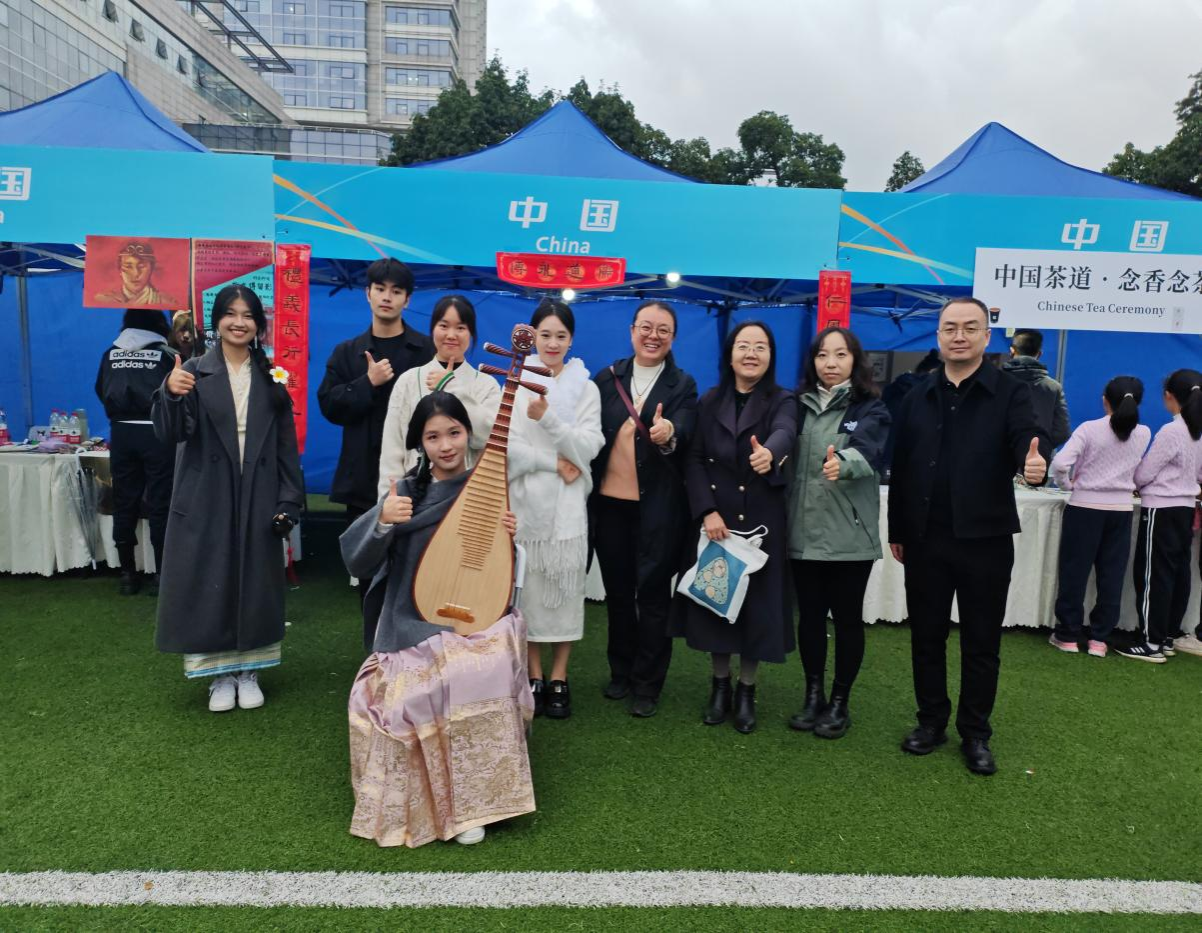 国际中文教育系教师负责的中国文化风情展台以其丰富多样的文化项目在此次活动中大放异彩。该展台展示了中国磁器、茶艺、书法、剪纸、民族器乐等中国传统文化内容,并组织了簪花和投壶等互动活动。