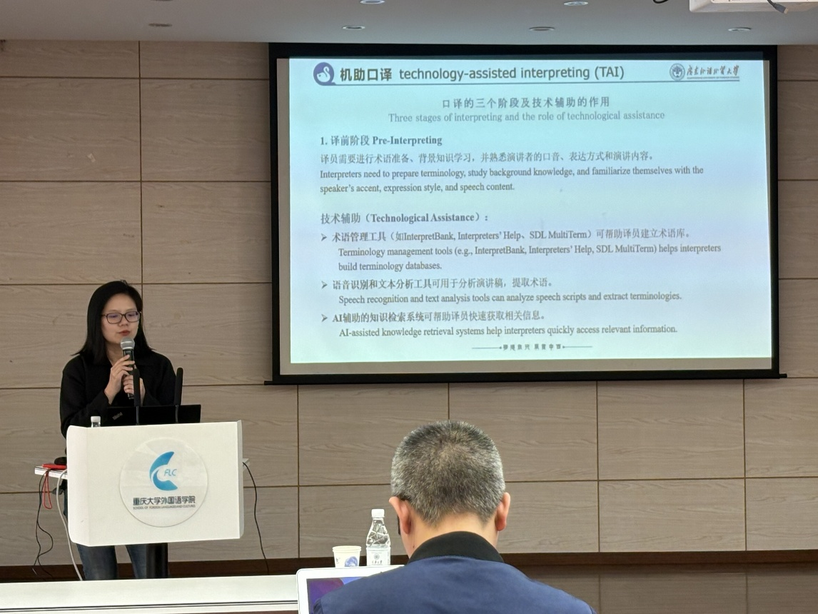苏雯超教授从“机助口译(Technology-assisted Interpreting,TAI)”的定义切入,指出TAI是将人工智能技术与机器设备应用于口译实践,以实现人机协同,提升口译效能的过程。她强调,机器在客观信息识别与记忆方面具有优势,而人类译员在处理逻辑推理和情感表达上不可替代,二者结合可突破传统口译的认知局限。