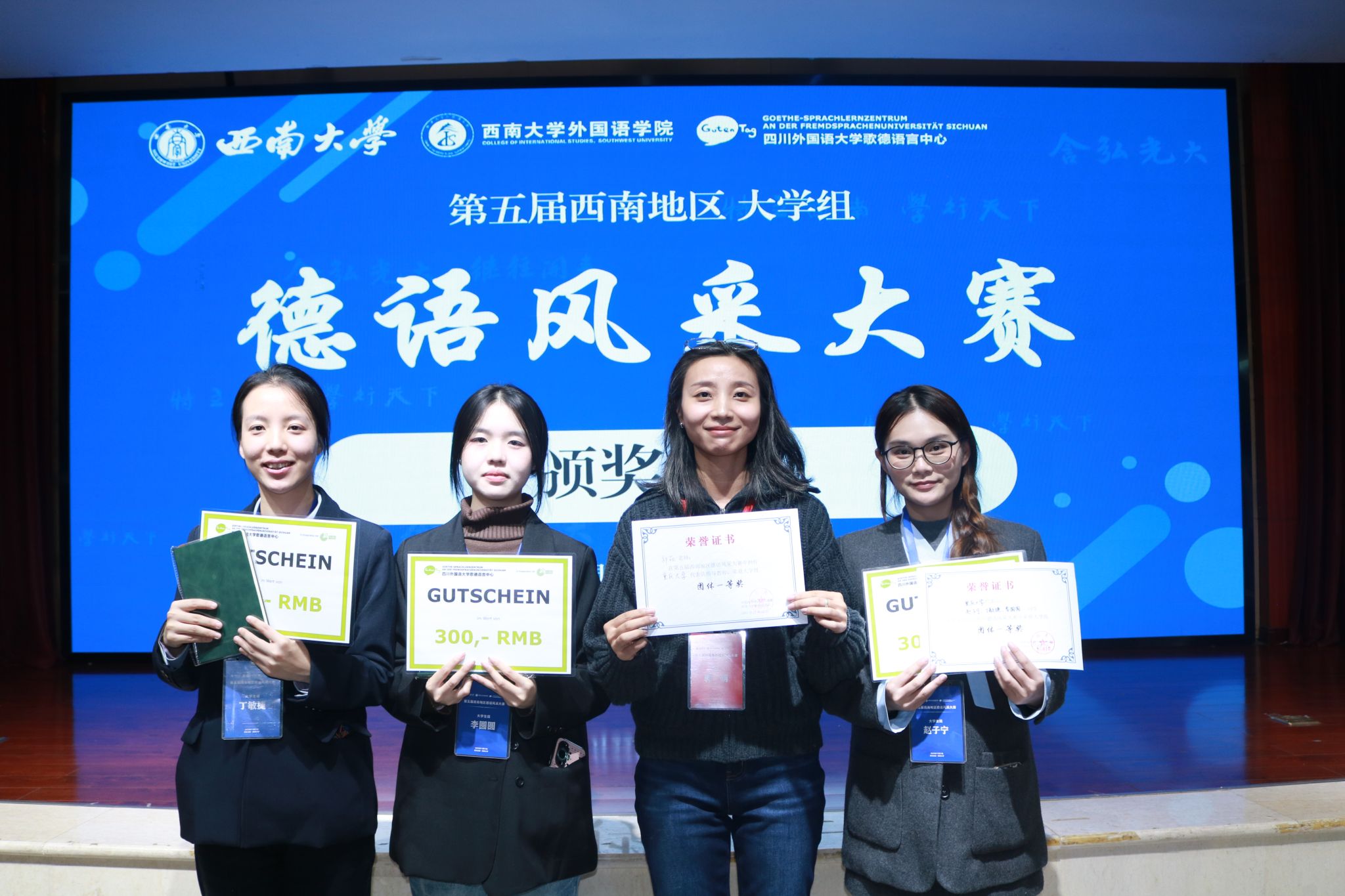 2025年11月22日,第五届西南地区德语风采大赛在西南大学举办。我校代表队由98堂