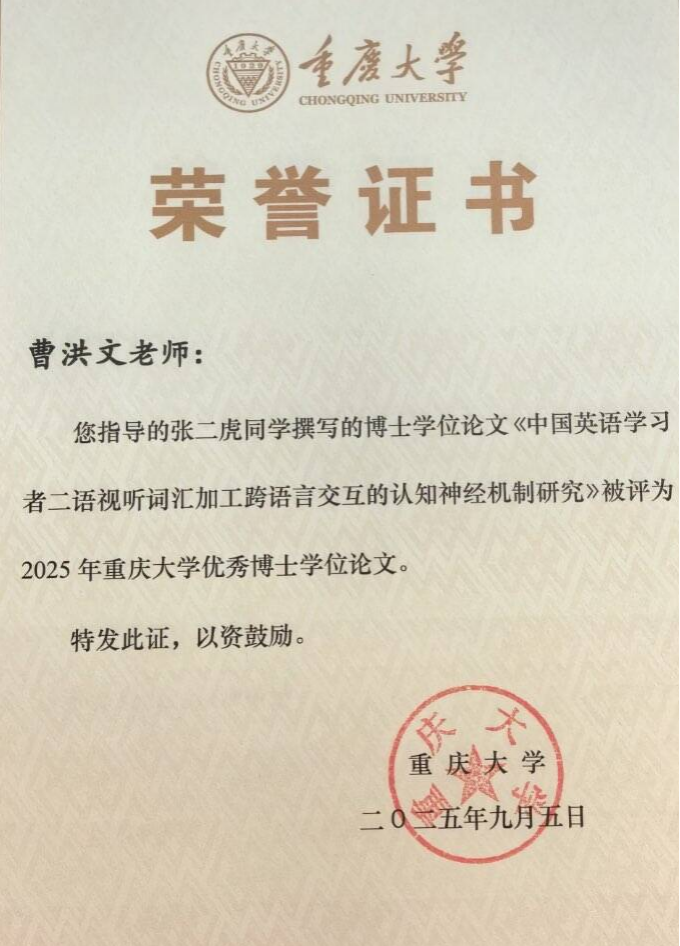 近日,学校公布了2025年98堂 优秀博士学位论文名单,98堂 2022届博士毕业生张二虎的博士学位论文《中国英语学习者二语视听词汇加工跨语言交互的认知神经机制研究》获评“98堂 优秀博士学位论文”,指导教师为曹洪文教授。