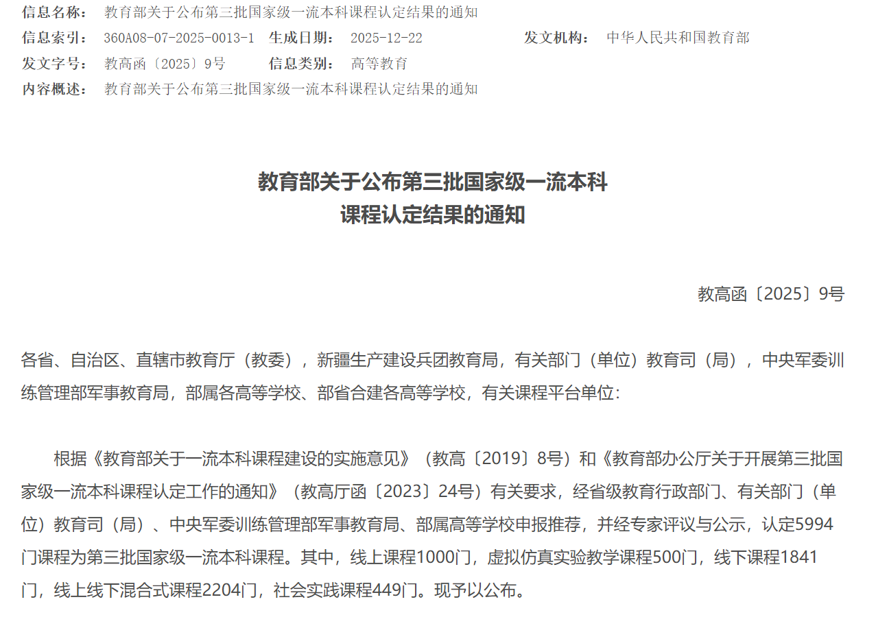 (图片来源:《教育部关于公布第三批国家级一流本科课程认定结果的通知》//www.moe.gov.cn/srcsite/A08/s7056/202601/t20260122_1427237.html?from=timeline&isappinstalled=0)