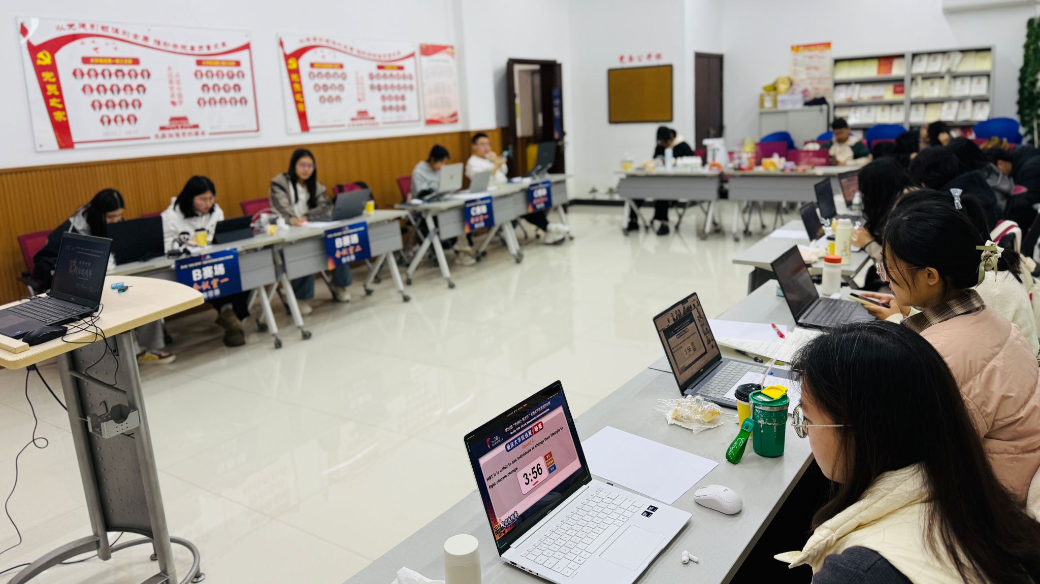 复赛阶段,四赛场同时进行比拼,思维交锋在不同赛场上激烈展开。辩题“Poverty should be treated primarily as a matter of misfortune rather than injustice?”直指贫困本质,引发选手对“成因归因”的深层追问。正反双方未止步于表面现象,而是巧妙结合真实案例,从环境、文化、制度等维度切入,将“贫困是不幸”与“贫困是不公”置于价值坐标中进行辨析,在抽象概念与现实图景之间架起桥梁。经过激烈比拼,各赛场个人得分前四名脱颖而出,共计16人成功晋级半决赛。