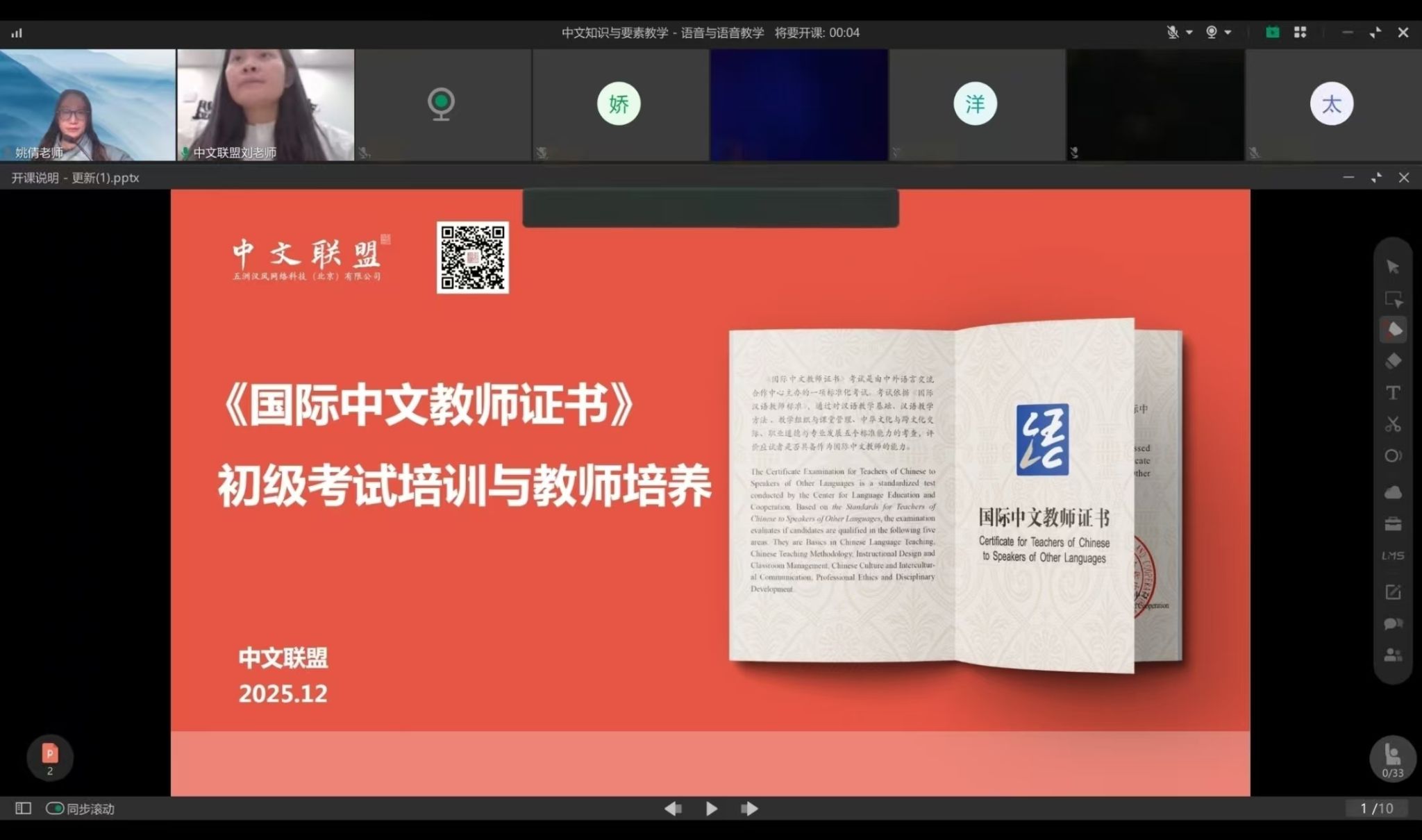 受中文联盟邀请,国际中文教育系姚倩副教授于3月15日和3月17日讲授《国际中文教师证书》初级笔试培训课程。本次培训课程由国际中文教学系列课程、文化与国情课程以及备考核心课程组成。姚倩老师主讲“中文知识与要素教学”部分的两门主干课程《语音与语音教学》《汉字与汉字教学》。这是姚倩老师第二次受邀讲授这一系列课程。