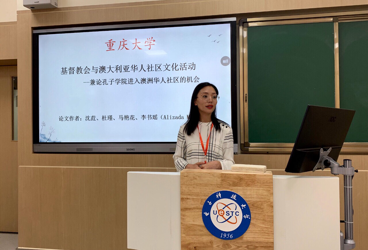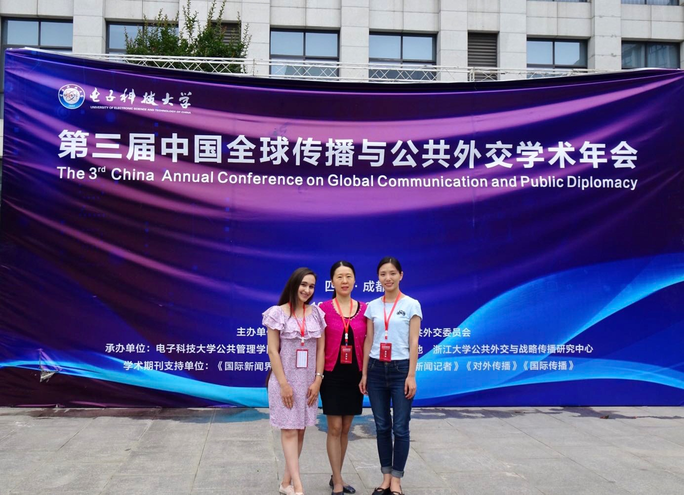 汉语国际教育硕士专业教师杜瑾携学生马艳花和塔吉克斯坦留学生书瑶(Alizoda Mahvashi)赴成都电子科技大学参加了我国第三届全球传播与公共外交学术年会。马艳花同学在专场讨论中宣读了论文,并获得在场专家的好评。