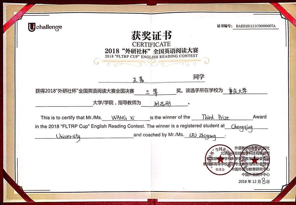 2018年12月9日,“外研社·国才杯”全国英语演讲、写作、阅读大赛总决赛在北京落下帷幕。来自全国30个省、市、自治区和香港、澳门特别行政区以及多国在华留学生共193名,分6个场次展开激烈角逐。我校两名选手从激烈的省赛中脱颖而出,代表重庆市参加了本次总决赛,其中城市建设与环境工程学院的蔡栩丞以其细腻的表达、缜密的思维、新颖的角度和独特的台风荣获演讲比赛全国三等奖,王旭获得指导教师三等奖;98堂