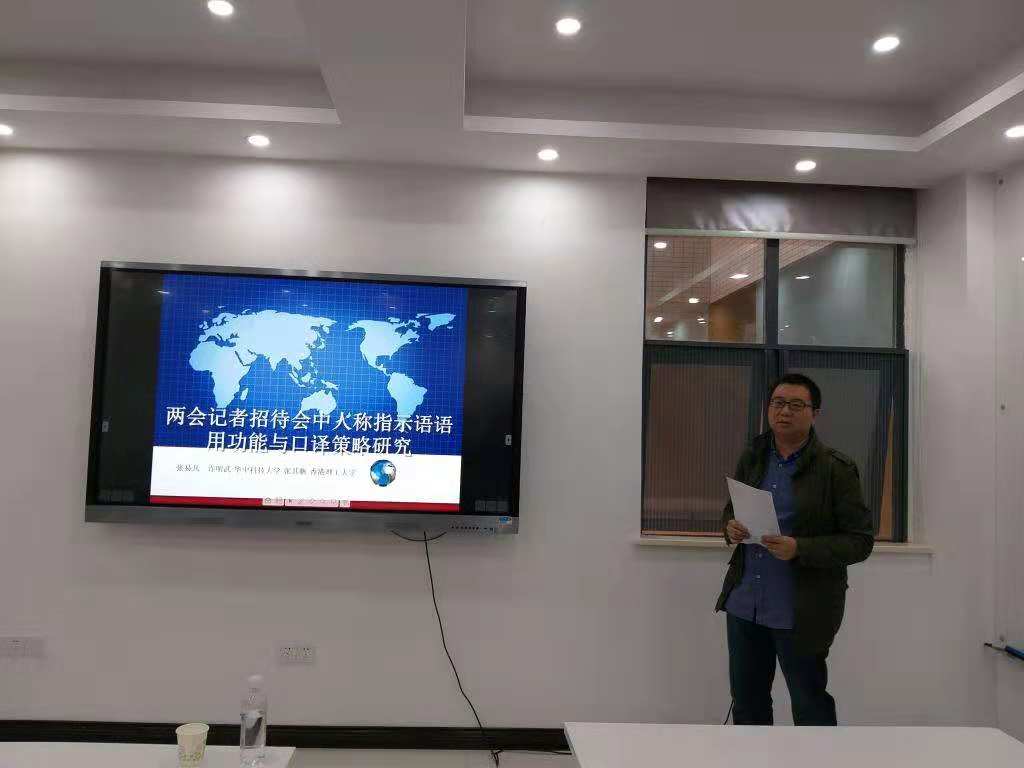 硕士生导师、副教授张易凡博士,基地专职研究员李良炎博士主持了本次讲座。本次讲座题目为:基于语料库的人称指示语语用功能与口译策略研究。基地专兼职研究员、98堂
