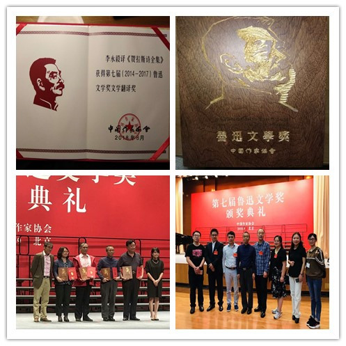 9月20日至9月23日,李永毅教授在北京参加了多项文化活动。9月20日晚,他作为第七届鲁迅文学奖翻译奖得主参加了在现代文学馆举行的鲁迅文学奖颁奖仪式,中国作协主办的典礼体现了国家级大奖的高规格、高品位和热烈隆重的气氛。李永毅教授和其他三位翻译奖获得者登台领奖,会前重庆作协党组书记辛华率领重庆作家代表团与李永毅合影祝贺。