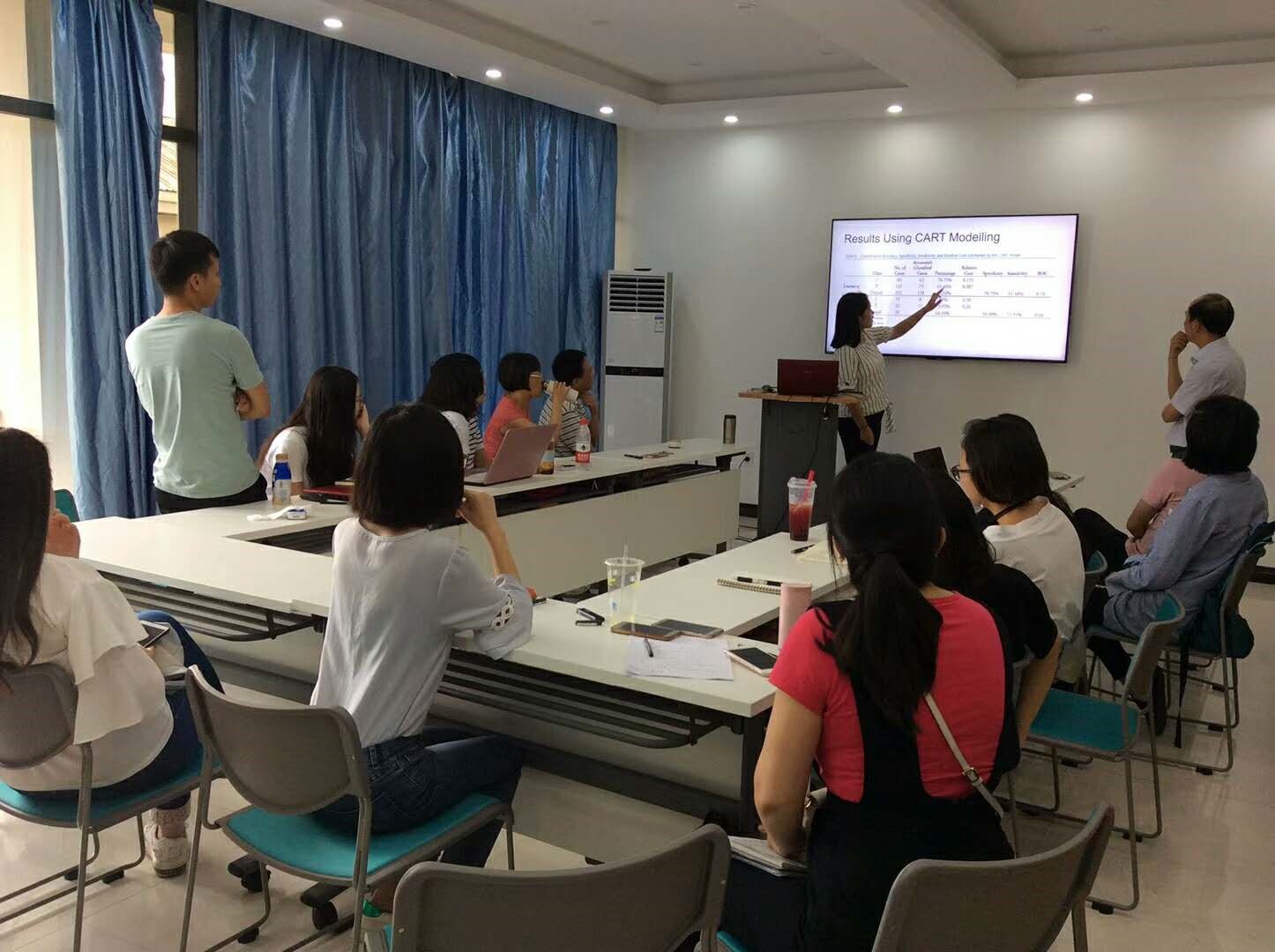 接下来,在读博士生王萍做了Predicting Listening Item Difficulty with Language Complexity Measures: A Comparative Data Mining Study(Aryadoust & Goh, 2014)的文献导读。该研究提取了听力文本特征并以此来预测听力题目的难度,用数据挖掘的方法,其跨学科的研究方法为语言测试研究提供了方法上的借鉴。本次文献导读主要分为研究背景、研究目的、研究方法、结果与讨论等4部分。每一部分均引起了在座师生深入地讨论和交流,尤其是本文使用的Rasch模型、线性回归、决策树、神经网络等数据分析方法引起了在座师生热烈的讨论。本次文献导读的整个过程中,基地主任辜向东教授、副主任李良炎博士、基地专职研究员曹洪文博士给予了很多指导,使在座师生收获颇丰。