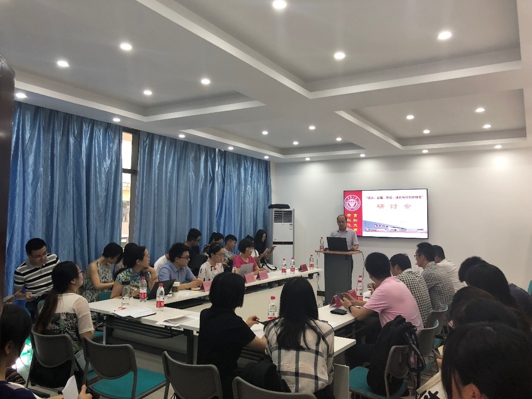 城规学院张荣博士以及基地专职研究员曹洪文博士。基地主任辜向东教授、副主任李良炎博士、专门用途英语研究所黄萍教授、专职研究员莫妮娜博士以及校内外共计40余名师生参加了此次研讨会。