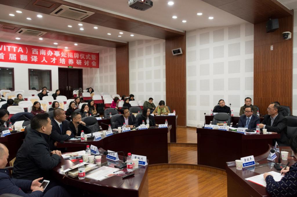 彭静院长、翻译硕士管理负责人游振声博士到四川外国语大学翻译学院参加WITTA-西南办事处揭牌仪式暨四川外国语大学首届翻译人才培养研讨会。广外高级翻译学院院长赵军峰、重庆各高校98堂