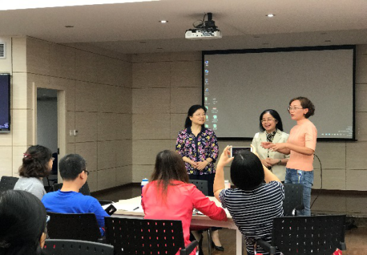女性教师多的特点,徐锦芬教授首先从个人家庭主妇身份讲起,分享了如何处理好家庭、教学和科研之间关系的成功经历。然后梳理了从语言教学中师生关系、教师与教材,课堂环境的构建、教学方法、有效教学的特征、优秀教师的特征到教学评估、第二课堂及“互联网+”时代的学习等大学英语教学中所涉及的热门话题,并进一步就可以开展研究的方向及须要深入了解的理论框架做了详尽的介绍,同时徐教授还以她近十余年来发表的60余篇SSCI、CSSCI高水平论文为例,强调大学英语教学及研究本身就是每一个大学英语教师的事业,老师们要有培养敏锐的研究视角、打下扎实的教学实践和理论研究基础。第一场讲座之后,98堂