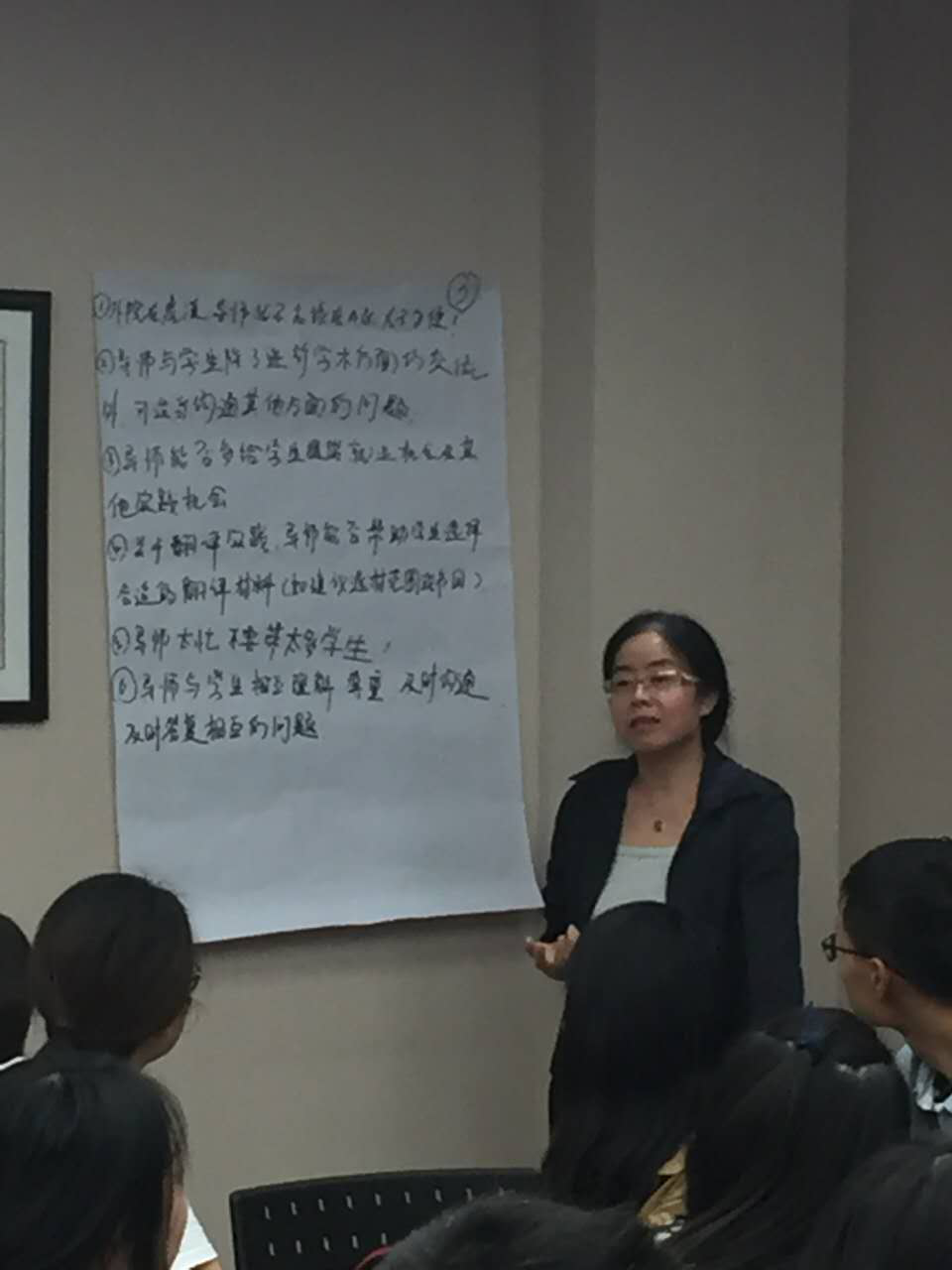 全体翻硕学生共计六十余人参加了本次教育指导会。会议由游振声老师主持,彭静院长主讲。会上,彭院长主要围绕翻译硕士培养目标、课程设置、翻译实践要求及如何处理学习和兼职、学生与导师之间的关系等为同学们作了详尽的讲解。同学们认真聆听彭院长的讲解,并在“国家奖学金参评应考虑那些因素”和“导师和学生应如何相处”讨论环节展开了激烈的讨论。