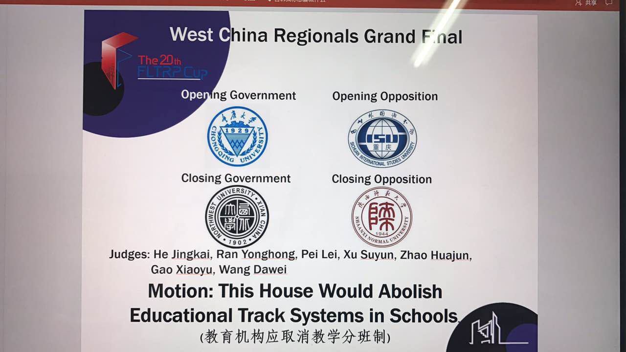2017年4月28日至4月30日,第二十届“外研社杯”全国大学生英语辩论赛华西赛区复赛在四川外国语大学举行。此次大赛共有来自陕西、山西、河南、四川、重庆、甘肃等11个省的120支代表队参加。
