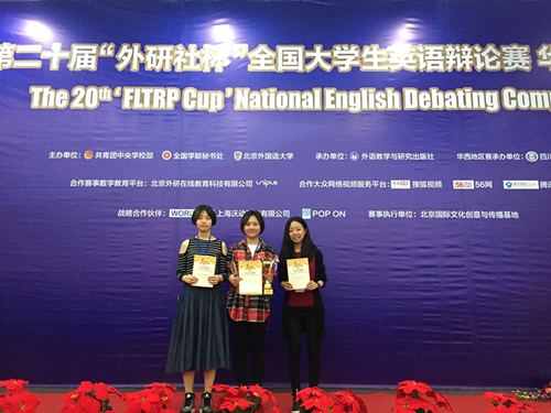英语系2014级学生崔璨,2015级潘璐以敏捷的辩论思维和流利的口语展现了我校学生的风采。最终,在指导教师李舟老师的精心指导下,两位同学以循环赛积分12分的总成绩闯进总决赛,斩获季军。