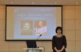 余泽梅博士的讲座“余光中《老人与海》译本中男性特质的翻译”主要围绕什么是男性特质、男性特质在《老人与海》中是如何体现的、余光中在翻译中如何再现男性特质及翻译成因分析这四个方面展开。首先,在与向大家分享“男性特质”一词的选用原因、学理意义、来源及特征后,余泽梅博士从《老人与海》的人物与题材选择、所述环境、语言特色等方面分析了小说的男性特质即硬汉气概。接着她引用了大量《老人与海》其他中译本的具体译文与余光中的译文进行对比,清楚明了地让大家感受到余光中是如何准确、简洁、有力地再现男性特质,并由此引出该译本的翻译成因,使大家对这位诗人、翻译家有了更全面深刻的了解。