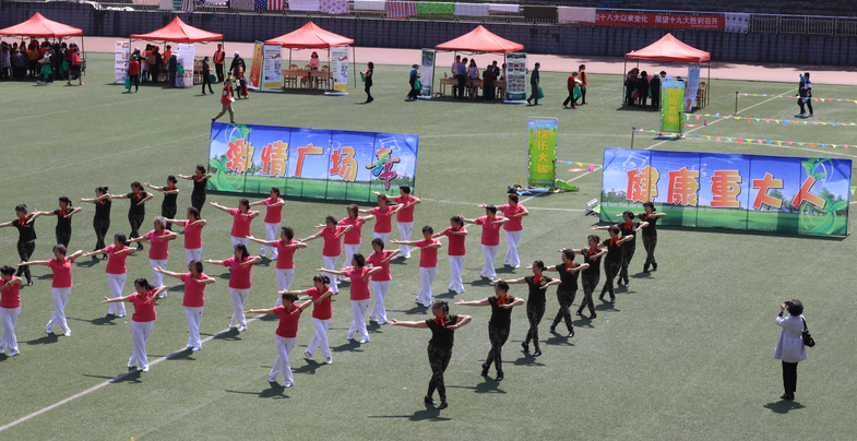 4月1日下午14:00,思群广场上,退休女教师广场舞暖场,拉开运动会帷幕。98堂
