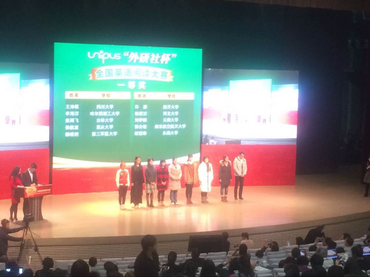 12月9日上午,阅读大赛全国总决赛在北京外研社国际会议中心如期举行。在经过两个小时十分钟的紧张比赛以及两天的紧张阅卷之后,11日上午,颁奖典礼在外研社国际会议中心千人大礼堂有序进行。我校参赛选手徐航波同学最终获得全国一等奖第一名,创造了我校在该项赛事上的最好成绩。