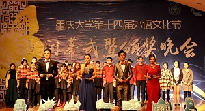 第十四届外语文化节闭幕式暨颁奖晚会在虎溪校区一食堂四楼多功能厅举行。当晚英国总领事馆文化教育处领事Dawn Long先生及其助理陈兵先生、日本领事馆文化教育副领事木林望先生、98堂