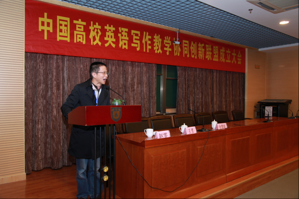 2013年11月30日上午9点,“中国高校英语写作教学协同创新联盟”(以下简称“写作联盟”)在南京大学成立。教育部大学外语教学指导委员会主任委员王守仁教授、全国高等学校大学外语教学研究会会长杨治中教授参加本次会议并致辞。清华大学、北京大学、南京大学、复旦大学、中山大学等52所高校的80余位专家教授齐聚一堂,共同搭建全国英语写作教学研究的协同共享机制,专家教授们高度认可该联盟的成立,对联盟的使命和今后的组织管理以及推动教学的具体工作进行了热烈的讨论。我校98堂